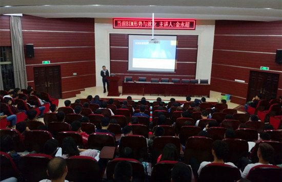 讲座上,金老师讲解了BIM的起源及未来发展趋势,并结合BIM在现代化建筑工程中的应用视频,展示了其强大的功能及与传统建筑技术相比所具有的优越性。金老师启迪现场学生,要认清行业发展形势,认真学习掌握BIM技术,适应社会发展对人才的高要求。讲座最后,金老师还与同学们进行了互动,耐心为大家答疑解惑。