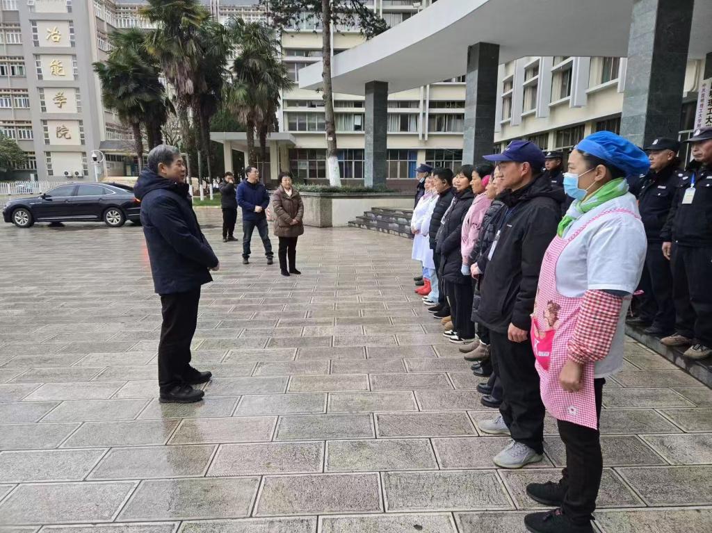 王华一行先后走访了各校区门岗、食堂、校医院、学生社区等关键岗位,认真听取各单位关于假期服务保障、安全管理及值班安排的工作汇报,详细询问春节期间设备运行、物资储备、应急响应等落实情况。在门岗执勤点,他与安保人员深入交流,强调要严格履行出入登记制度,筑牢校园安全“第一道防线”;在学生食堂,他仔细查看年夜饭准备情况,叮嘱后勤人员既要保障留校师生饮食健康,也要营造温馨的节日氛围;在校医院,他关切询问医护人员值班安排和医疗物资储备,对大家的专业坚守表示感谢。