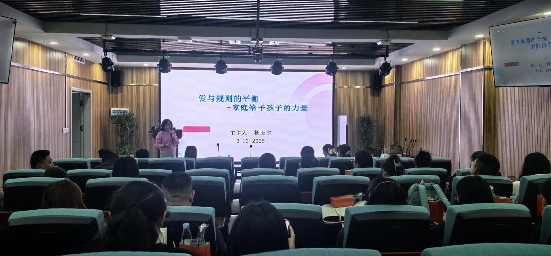 杨玉宇老师以“爱与规则的平衡--家庭给予孩子的力量”为题,通过热身活动开启,主要围绕良好的家风家规,健康积极的家庭教育形成,分别从家庭成员的情感联结及规则训练展开,为教职工带来了一场生动诙谐、极具启发的讲座。