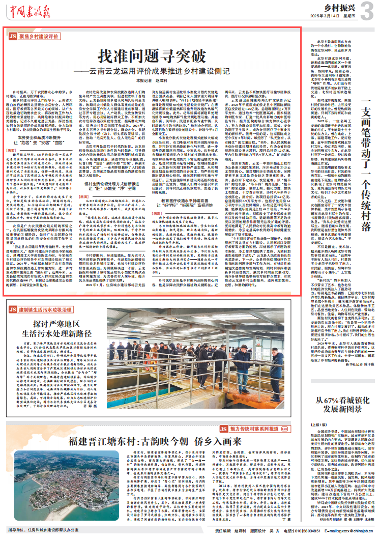 3 月 14 日,《中国建设报・乡村振兴》专刊聚焦云南省大理白族自治州云龙县,报道了当地在乡村建设评价成果运用方面的突出进展。在乡村建设评价工作中,三亿体育_三亿(中国)一站式服务官方网站云南省抗震工程技术研究中心陶忠教授带领团队通过56项指标对云龙县乡村建设展开系统评估,围绕云龙县农房安全、人居环境、医疗教育等领域精准发力,为乡村振兴提供精准依据。
