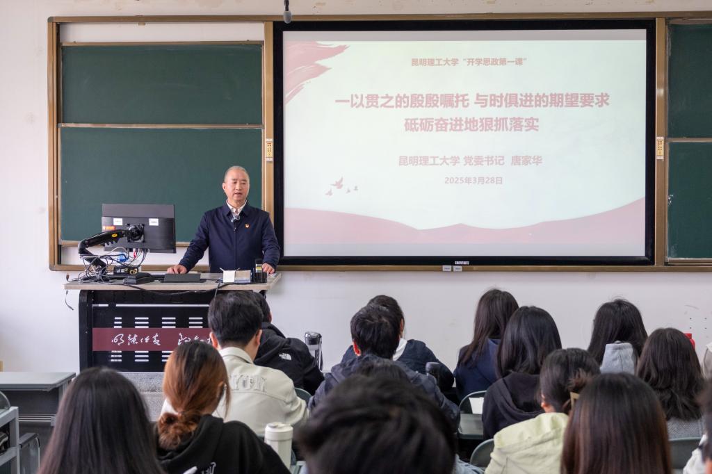2025年3月28日,校党委书记唐家华在呈贡校区中心区教学楼506教室以“深入学习贯彻习近平总书记考察云南重要讲话精神、为在中国式现代化进程中开创云南发展新局面贡献昆工力量”为题,为师生讲授“开学思政第一课”,学生代表、党员代表、入党积极分子代表、思政课教师代表及三亿体育_三亿(中国)一站式服务官方网站职能部门领导、马克思主义学院班子成员、思政课教研室负责人参加了学习。