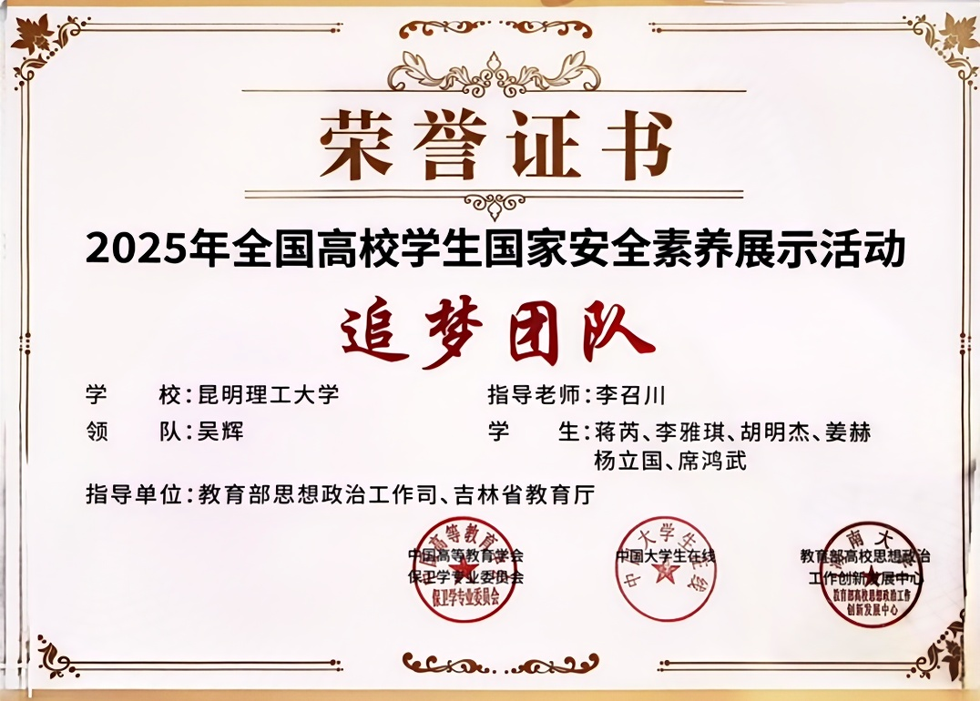 在第十个全民国家安全教育日到来之际,2025年全国高校学生国家安全素养展示活动在吉林大学举办。活动以“自觉维护国家安全,共同建设教育强国"为主题,全国28个省市共29个高校代表队、360余名师生同台竞技,三亿体育_三亿(中国)一站式服务官方网站代表队一路“过关斩将”,取得全国第十名的佳绩,并斩获国家安全素养展示活动“追梦团队”荣誉称号!