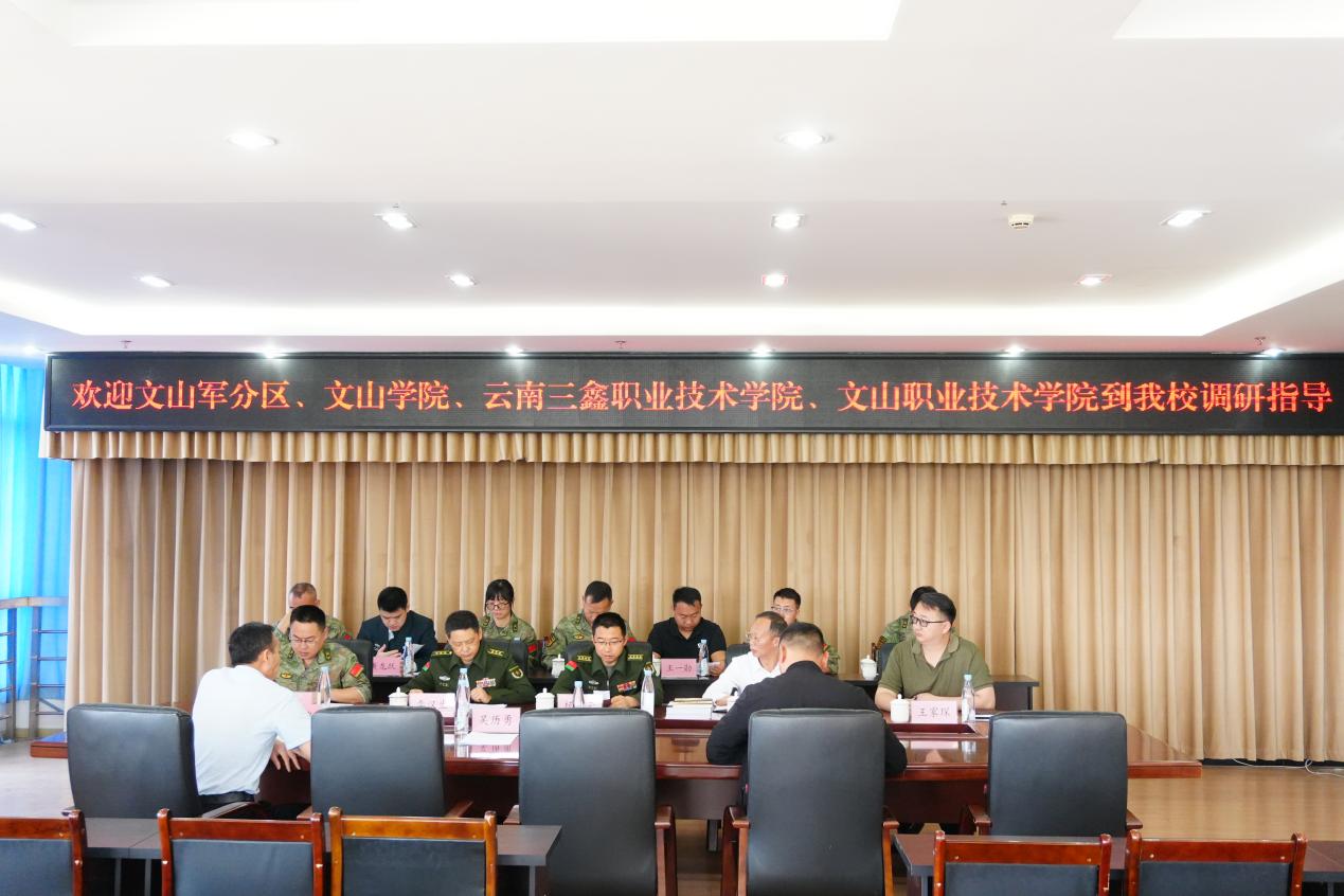 4月24日,文山军分区大校副司令员杨少云、文山学院党委副书记冯林虎以及文山军分区、文山学院、云南三鑫职业技术学院、文山职业技术学院相关部门负责人一行到校调研交流武装部规范化建设工作。校党委副书记陈华仙出席活动。