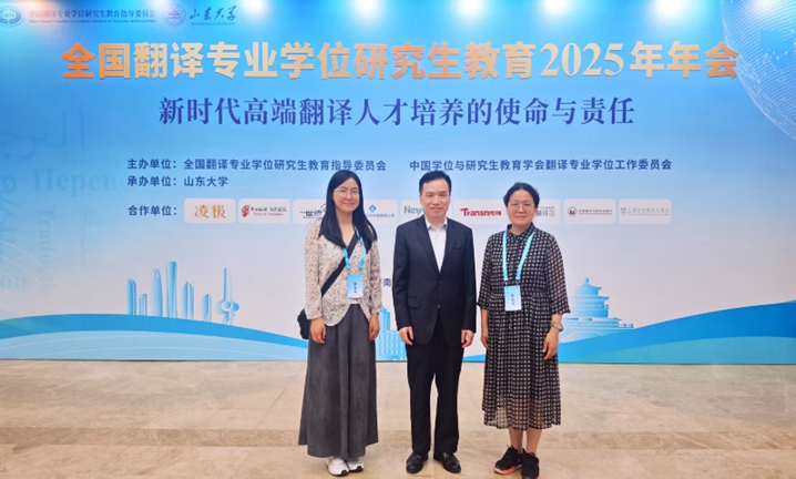 5月17日至18日,全国翻译教指委2025年工作会议暨全国翻译专业学位研究生教育2025年年会在山东济南召开。本次年会紧扣国家战略发展和国际传播需求,以“新时代高端翻译人才培养的使命与责任”为主题,旨在共同探讨人工智能时代高等院校高端翻译人才培养的创新思路和有效举措。外国语言文化学院王英教授一行2人参会,王英在专题论坛上发言。