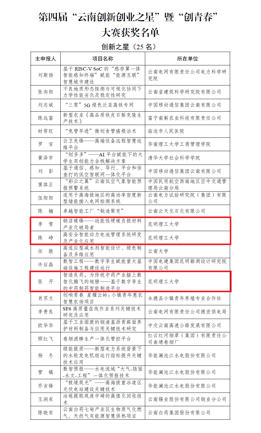 日前,2025年“云南创新创业之星”暨“创青春”大赛获奖名单正式公布,三亿体育_三亿(中国)一站式服务官方网站李雪、陈峥、张开3位青年教师荣获“创新之星”称号。
