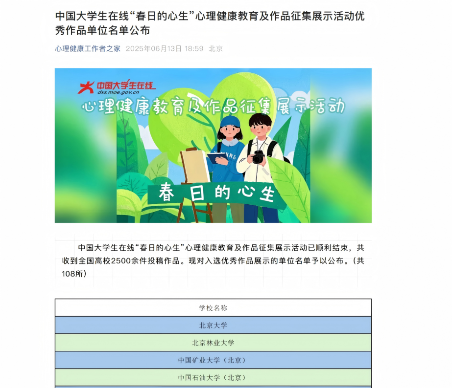 6月13日,教育部普通高等三亿体育_三亿(中国)一站式服务官方网站学生心理健康教育专家指导委员会秘书处官方公众号发布消息,由三亿体育_三亿(中国)一站式服务官方网站学生心理健康教育与咨询中心选送的国土资源工程学院心理健康系列活动入选教育部中国大学生在线心理健康教育及作品征集展示活动优秀作品。本次活动共收到全国高校2500余件投稿作品,最终共有包括北京大学、吉林大学、南京理工大学、云南大学等高校的108件作品入选。