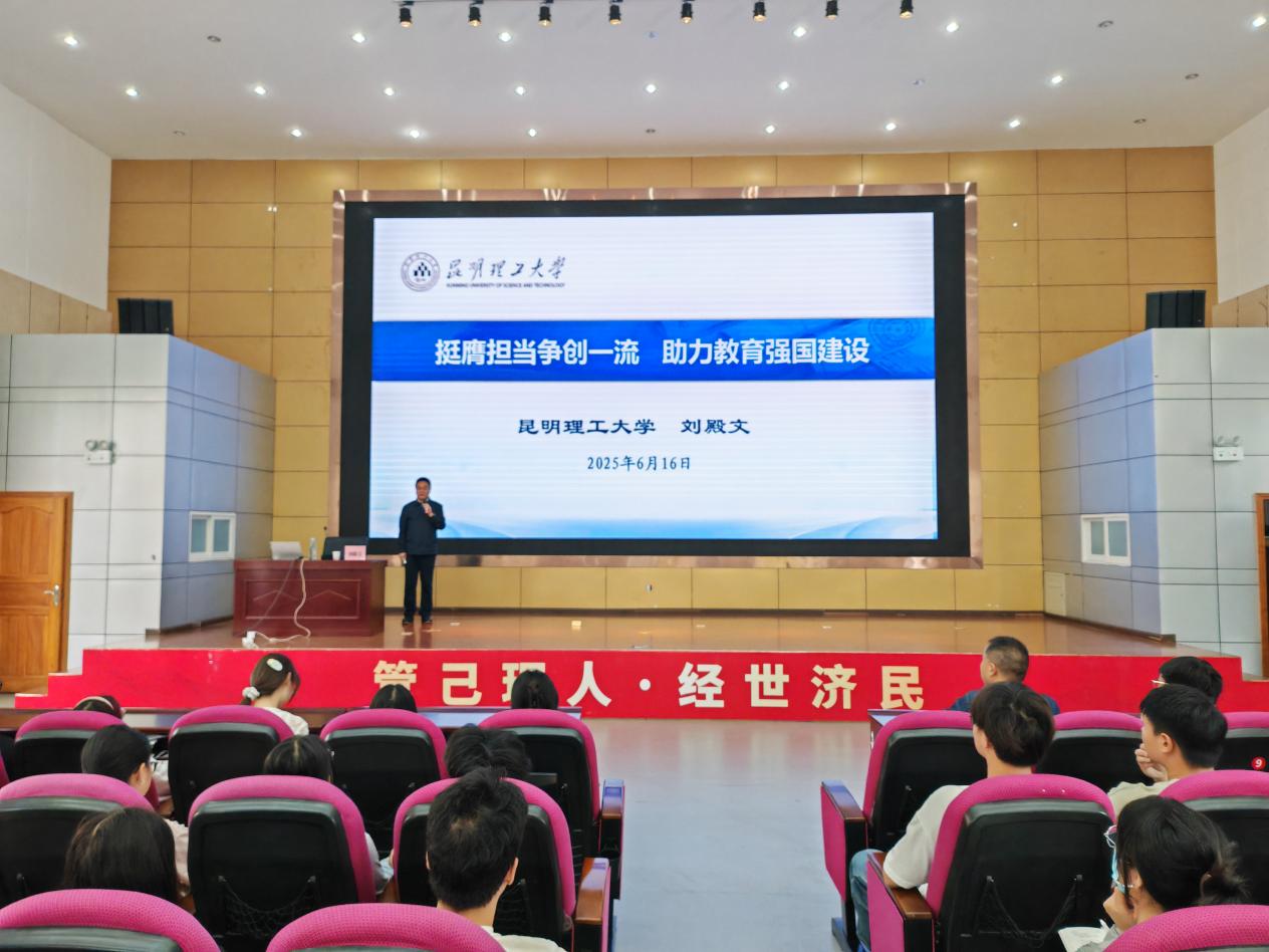6月16日上午,校党委常委、副校长刘殿文在呈贡校区管理与经济学院报告厅,为分管联系学院师生代表讲授题为“挺膺担当争创一流 助力教育强国建设”的思政课。管理与经济学院、法学院、理学院师生代表和校青年志愿者联合会的学生代表近100人参加活动。