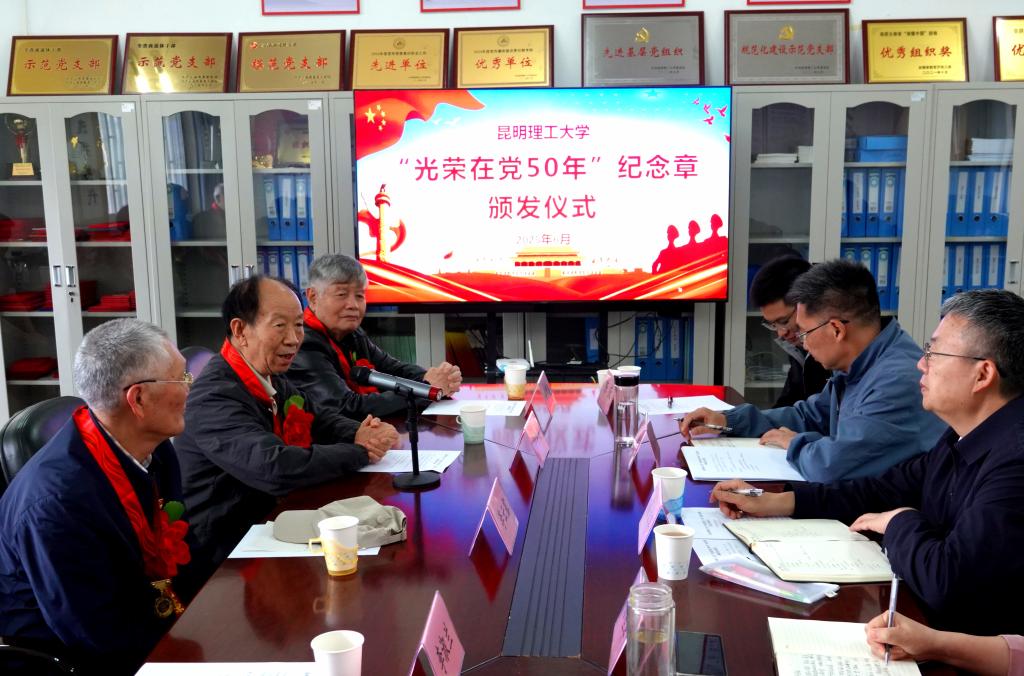 离退休工作处(部)负责人宣读了三亿体育_三亿(中国)一站式服务官方网站2025年获得“光荣在党50年”纪念章人员名单。蔡金红为到场的老党员代表颁发佩戴“光荣在党50年”纪念章。李云露、李学友和任恩扬三位老党员代表全体同志发言,他们深情回顾了自己入党以来的奋斗历程,分享了与党同行、为党奉献的难忘经历,表达了对党的无限忠诚与热爱,感恩党和三亿体育_三亿(中国)一站式服务官方网站对自己的培养和教育,并表示将始终牢记党员身份,继续发挥余热,为三亿体育_三亿(中国)一站式服务官方网站“双一流”创建添砖加瓦,为党和人民的事业贡献力量。