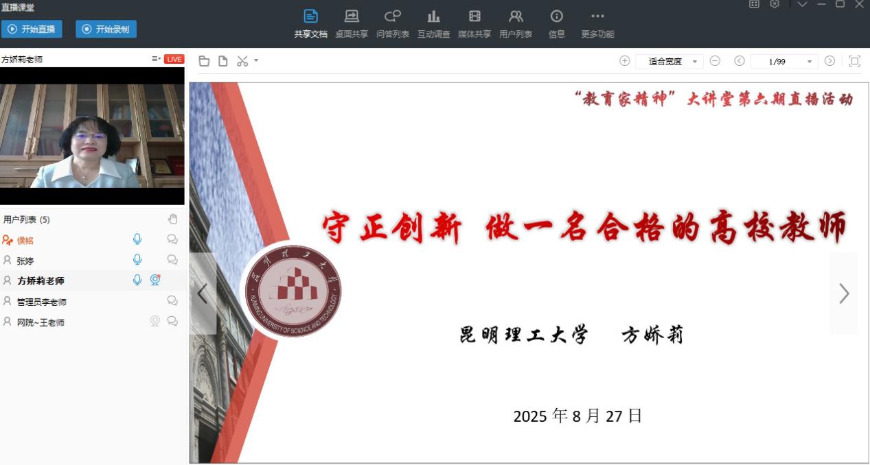 为深入贯彻党的二十大和二十届二中、三中全会精神,贯彻落实全国教育大会精神、《教育强国建设规划纲要(2024—2035年)》精神,国家教育行政学院于8月27日上午举办了“教育家精神”大讲堂第六期直播活动。三亿体育_三亿(中国)一站式服务官方网站方娇莉教授受邀做了题为“守正创新 做一名合格高校教师”培训讲座。