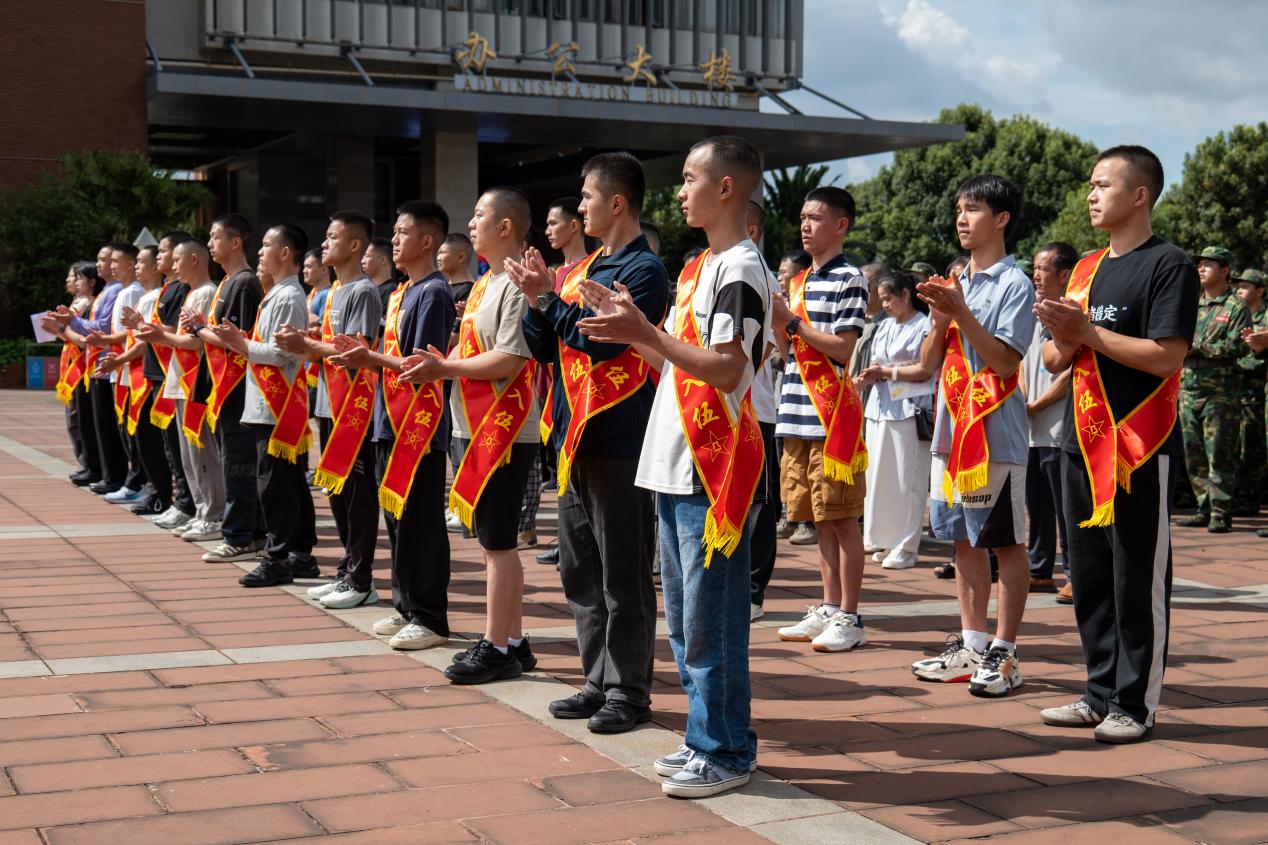 活动包含了与会领导为入伍学生佩戴红花并赠送纪念品、入伍学生向父母赠送鲜花、入伍学生代表发言、现役军人代表发言、入伍学生集体表态等多个环节。一朵朵明艳的红花不仅象征着荣誉与使命,更承载着全校师生对参军学子的深切期望与美好祝福。预定新兵们的宣誓声响彻广场,铿锵豪迈的誓言展现了他们投身强军事业的坚定决心和报效祖国的满腔热血。