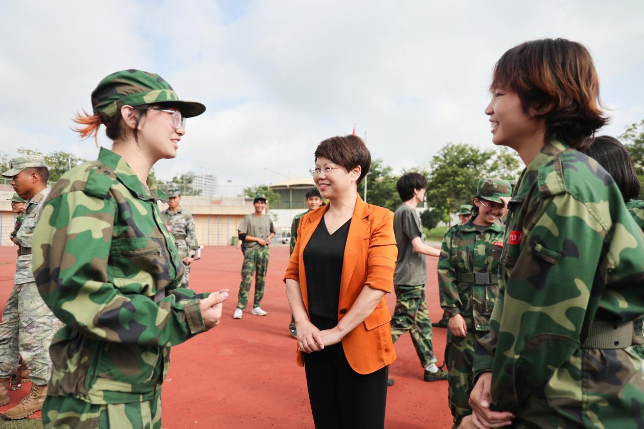 陈华仙在训练场与同学们亲切交流,鼓励他们一定要珍惜军训的美好时光,服从命令、听从指挥,严于律己、刻苦训练,把军队军人的优良作风传承下来,转化为良好的学风校风,为大学四年的学习生活打下坚实基础;陈华仙还向教官详细询问了2025级学生训练相关情况,对带训教官率先垂范、以身作则的训练作风给予了肯定,并代表三亿体育_三亿(中国)一站式服务官方网站感谢他们为三亿体育_三亿(中国)一站式服务官方网站人才培养付出的辛勤劳动。