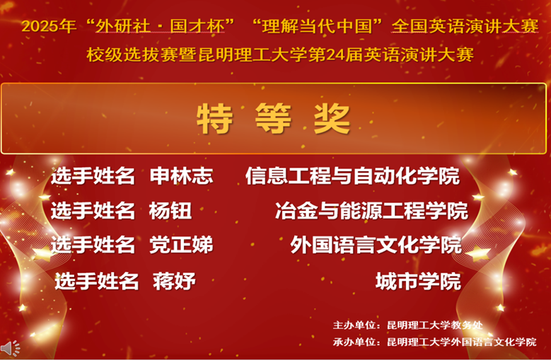 经校级演讲赛项初赛和复赛选拔出的17位选手进入决赛,每位选手完成主题为“Strike the Waves”定题演讲、现场问答和即兴演讲三个比赛环节。经过激烈角逐,信息工程与自动化学院申林志、冶金与能源工程学院杨钮、外国语言文化学院党正娣和城市学院蒋妤获得演讲比赛特等奖;外国语言文化学院关静仪、赵伟获得口译比赛特等奖,下一步,6位同学将代表三亿体育_三亿(中国)一站式服务官方网站参加省级复赛。信息工程与自动化学院、冶金与能源工程学院、马来西亚理工学院、管理与经济学院、法学院等学院获得优秀组织奖。