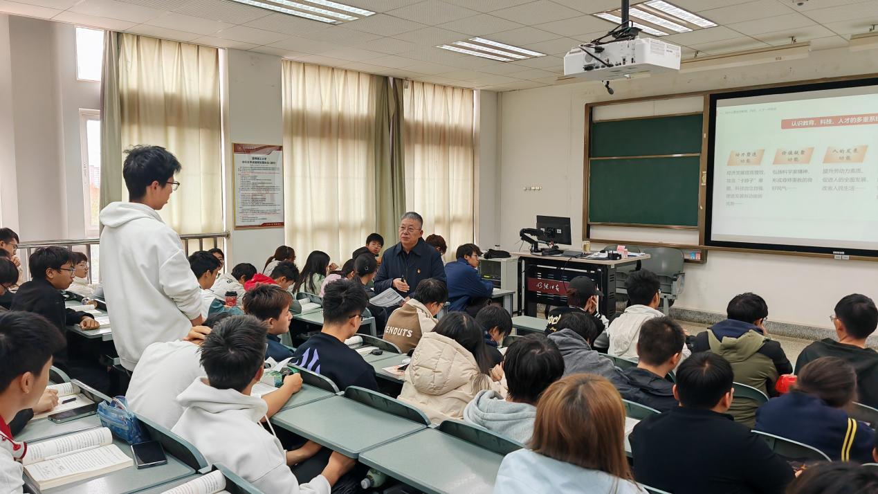 11月4日上午,校党委副书记蔡金红在多媒体教学楼306教室,以“社会主义现代化建设的教育、科技、人才战略”为主题,为自动化、法学、建筑等专业的2025级本科生讲授思政课。
