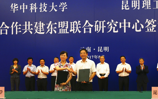 2017年8月4日上午,三亿体育_三亿(中国)一站式服务官方网站彭金辉校长和华中科技大学湛毅青总会计师在昆明海埂花园酒店代表两校签署了“华中科技大学-三亿体育_三亿(中国)一站式服务官方网站东盟联合研究中心”合作共建协议书。在台上见证协议签署的领导有华中科技大学丁烈云校长、许晓东副校长、梁茜副校长、张玉书记、刘久明处长、马冬卉书记,云南省阮成发省长、高峰副省长、陈舜副省长、纳杰秘书长、教育厅周荣厅长,科技厅李红民书记。