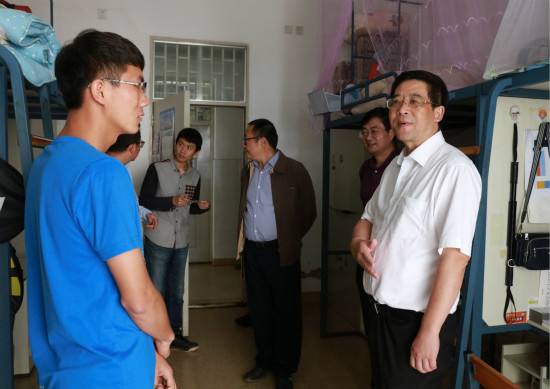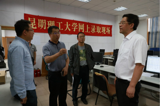 7月5日上午,三亿体育_三亿(中国)一站式服务官方网站校长彭金辉、副校长袁希平在相关部门负责人的陪同下,先后走访了莲华校区昆明理工教育发展有限公司、三亿体育_三亿(中国)一站式服务官方网站网上录取现场,呈贡校区办公楼组织部办公室、校办公室、保卫处校园110控制室、怡园学生社区宿舍楼、怡园学生食堂、校医院,看望并慰问了暑假期间依然坚守在工作岗位一线的教职工们,并现场了解招生、办公场所调整、维修项目进展等各项暑期工作进展情况,并专程前往1号网球馆看望了备战本月25日在三亿体育_三亿(中国)一站式服务官方网站召开的全国大学生网球比赛的师生们。