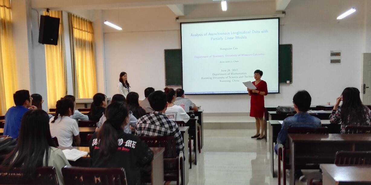 6月26日下午,美国密苏里大学曹宏媛博士到三亿体育_三亿(中国)一站式服务官方网站进行学术交流,并作了题为“Analysisof Asynchronous Longitudinal Data with Partially Linear Models”(非同步纵向数据的部分线性模型分析)的学术报告,理学院20余名师生参加了本次报告会。