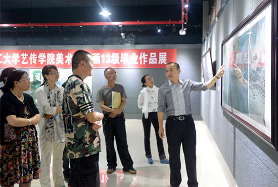 6月23日上午,周峰越副校长到校美术馆点评艺术与传媒学院正在展出的绘画131班毕业作品“巡青”。