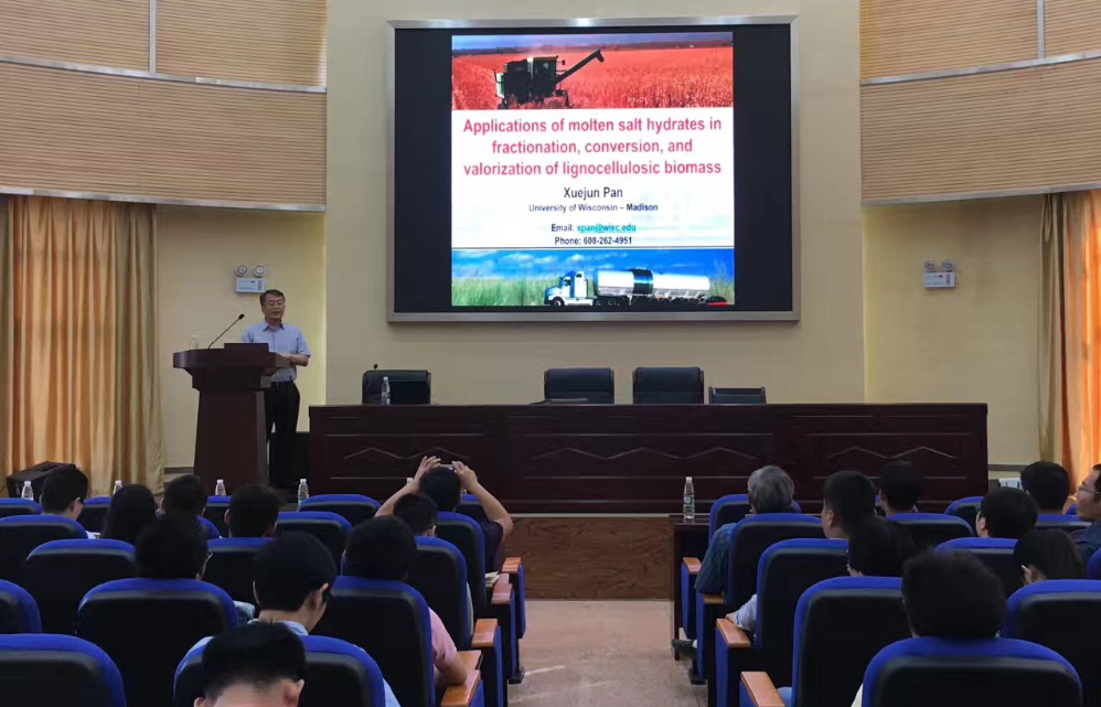 潘学军教授简要介绍了美国威斯康星大学的基本概况和教学科研情况,分享了他的研究团队近年来在生物质精炼方面的主要研究工作和最新研究进展,对熔融盐水合物在木质纤维生物质分离、转化和高值利用中的应用进行了详细介绍。报告会结束后,潘学军教授与参会教师、研究生和企业代表就相关前沿性科学问题进行了深入交流和探讨。