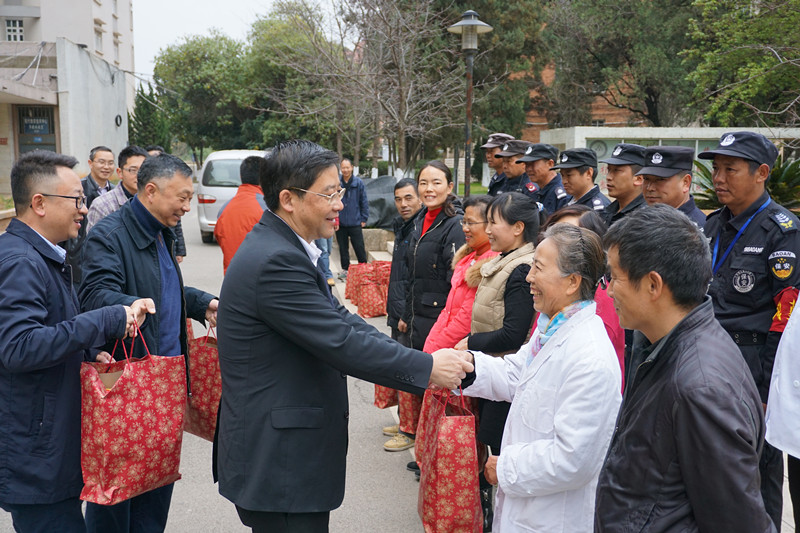 在春节前夕开展向在岗职工送温暖活动是我校长期坚持的一项工作。2017年1月27日大年三十,彭金辉校长与相关职能部门负责人一起,带着新春祝福,先后到莲华、新迎、呈贡三个校区看望并慰问仍然坚守在保卫、社区、后勤、医院岗位的职工。彭校长对大家在寒假春节期间坚守工作岗位、全力做好服务保障工作表示感谢并向职工们分发了节日慰问品。 受慰问的职工对校领导一行的关怀表示感谢,并保证一定要尽心尽力,为节日期间创造和谐稳定的校园环境。