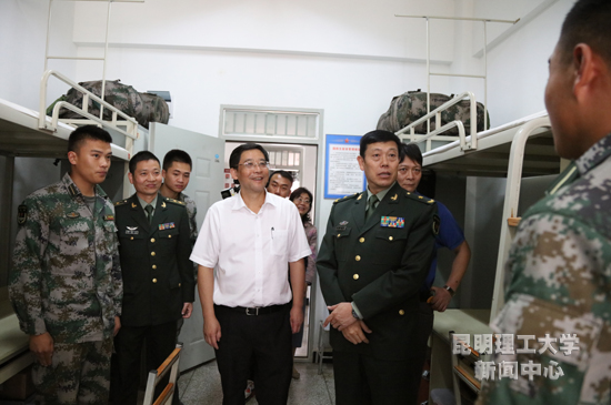 杨司令一行深入学社社区恬园10栋国防生楼,参观了器材室、健身房、阅览室、办公室等,关心询问国防生的工作、学习、生活情况。在国防生宿舍,杨司令专程看望了来自西藏、迪庆等地的藏族国防生,并用自己坚守藏区服务十年的亲身经历,勉励少数民族国防生要为维护民族团结贡献自己的力量。