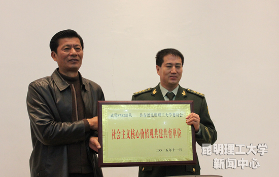 12月3日上午,武警8752部队与校团委关于社会主义核心价值观共建共育基地签约授牌仪式在呈贡校区机电楼报告厅举行,校党委副书记张劲松出席签约授牌仪式。武警8752部队相关负责人,我校党办、宣传部、武装部、学生处、及校团委等职能部门主要负责人,我校270余名学生代表参加了签约授牌仪式。