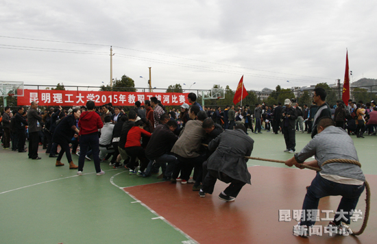 11月4日至19日,2015年教职工拔河预决赛分别在莲华和呈贡校区举行。最终,校机关、学生社区教育管理中心、材料科学与工程学院获得并列第一名;化学工程学院、建筑工程学院、理学院获得并列第二名;分析测试中心、医学院、津桥学院、城市学院、后勤保障处和冶金与能源工程学院获得并列第三名。拔河比赛共有30个基层单位750人次参赛。
