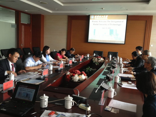会上,张英杰校长向来宾介绍了我校的基本情况,并就高知工科大学先后为我校五名教师和学生提供全额奖学金攻读博士学位表达了诚挚的谢意。磯部雅彦校长介绍了高知工科大学的基本情况,特别是全英文授课的专业设置、留学生情况等,并表达了今后与我校开展学生长短期交流、教师科研合作等实质性交流的愿望。程赫明副校长就我校国际交流的情况,特别是与日本高校的合作交流情况做了详细介绍,希望在已有的交流项目基础上,扩展与高知工科大学进行师生交流的学科范围。之后,双方就学生交流项目的宣传、遴选条件、费用情况,以及教师交流项目的操作方式、费用情况等进行了深入而具体的探讨。双方一致同意,将在前期签署的合作备忘录的基础上,扩展交流项目的学科范围,建立教师间的科研合作,深化两校间的师生交流。最后,张英杰校长以三个“动”和一个祝愿为今后两校间的各类合作与交流提出了希望:“生命在于运动;金钱在于流动;朋友在于走动。”“祝愿两校增强友谊、加强合作。”