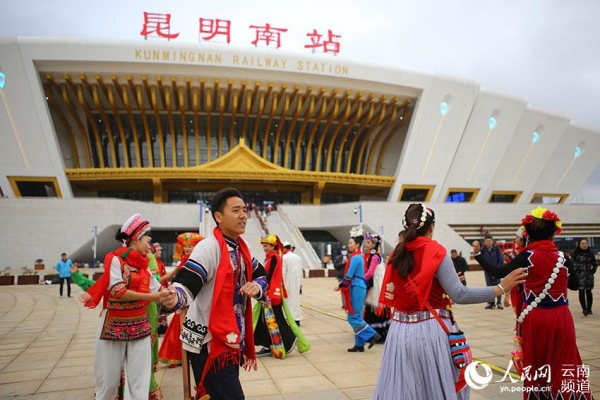 人民网昆明12月28日电 (李发兴、薛丹)随着一声鸣笛声,12月28日10时整,由昆明南开往贵阳北的G4136、开往南宁的D4208、开往玉溪的D9109同时发车,驶离站台。