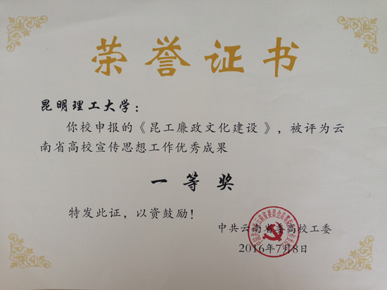 近日,根据《中共云南省委高校工委关于公布2016年高校宣传思想工作优秀成果名单的通知》(云高工宣[2016]11号),经各高校择优推荐,专家评审,三亿体育_三亿(中国)一站式服务官方网站申报的”昆工廉政文化建设——突出分类教育重点,营造风清气正的校园廉政文化氛围”荣获云南省高校宣传思想工作优秀成果一等奖。