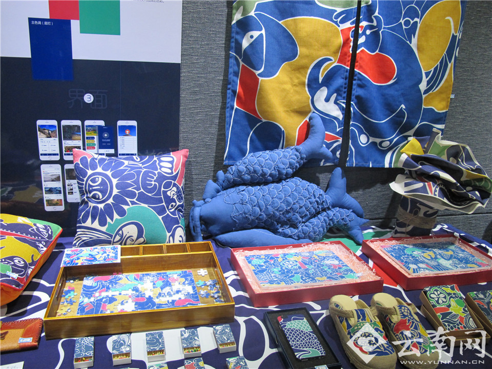 在赵杰带领的小组中,毕业生们锁定了元阳深处的哈尼传统村落——阿者科,那里如诗如画的梯田美景、传统古朴的哈尼蘑菇房、身着传统服饰的哈尼族少女、以及图腾传说都成了学生们的灵感源泉。在名为“艾西艾玛主题客栈”的展区,展台上铺的桌布是蓝、黄相间色彩鲜艳的床单、被罩,上面摆放着鱼形抱枕、手绘鞋子、火柴、钱包等一系列配套产品,而这些设计作品体现的是艾西艾玛主题客栈的视觉系统及推广。