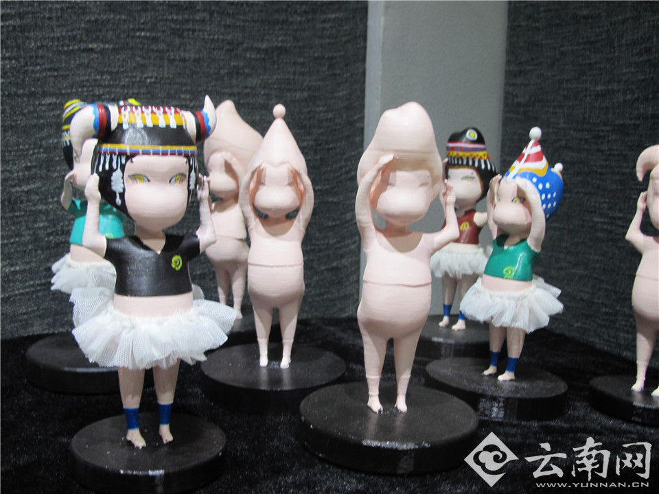 事实上,此次毕业创作展的许多作品都与时下科技的潮流紧密结合。有毕业生针对阿者科这一梯田深处的村庄,推出了“阿者科旅游APP界面及推广的设计”,希望通过目前人们常用的旅游APP,来吸引旅客来感受阿者科这个美丽的“世外桃源”。当然,还有的毕业设计用上了3D打印技术,展区里一群戴着哈尼族头饰的玩偶就是3D打印成型后再上色的,有趣的是这些哈尼族少女穿的却是小小的芭蕾裙。“我们的学生不想做千篇一律的民族娃娃,希望能够更时尚一些,所以在保留哈尼族元素的同时,为玩偶穿上了芭蕾裙”,赵杰笑着说。