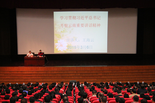 报告会上,王海云教授从4个层次精彩讲授了怎样把思想和行动统一到习近平总书记考察云南重要讲话精神上来;怎样深刻领会,正确把握学习其思想内涵和精神实质;怎样牢牢抓住“五个着力”,推动云南,推动红河经济社会全面发展;以及怎样迅速掀起学习热潮,奋力推动跨越发展。宣讲报告深入浅出地剖析了习近平总书记云南之行的历史和现实意义。王海云教授说,习近平总书记强调了云南发展的3个核心,既“努力成为我国民族团结进步的示范区、生态文明建设的排头兵、面向南亚东南亚的辐射中心”,这为云南在新的历史起点上,推进跨越发展指明了方向,注入了强大动力,也为云南的长远发展“把脉点穴”,为云南各族人民投身发展打开了思路,提振了信心和决心。