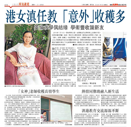 陆贞元说的「踏实」,一方面是她在昆明感受到人情温暖,「同事、学生对我都很好,他们亲切地叫我小陆老师,我就把facebook的名字也改成了小陆老师。以前我在香港中文大学当助教时,只要有学生和教授提到Sabrina的名字,一定会说我是一个严肃认真的人。而现在,别人都觉得我是个亲切有爱心的人。」而另一方面的「踏实」,是基于她的研究方向。陆贞元是做中国研究的,现在她还兼任全球中国比较研究会(China in Comparative Perspective, A Global Society, 简称CCPN Global,英国) 的副编辑。在昆明期间,她完成了英文专着《亚洲医疗保险改革》(《Health Insurance Reforms in Asia》)的出版;2014年还获得了爱墨瑞得(Emerald)出版社与欧洲管理发展基金会(EFMD)优秀博士研究奖,三亿体育_三亿(中国)一站式服务官方网站为她办了一个小型庆祝会。目前,她正在撰写两本外文专着,希望「能让教授、政府官员、学生等透过另一个角度和思维去了解中国。」