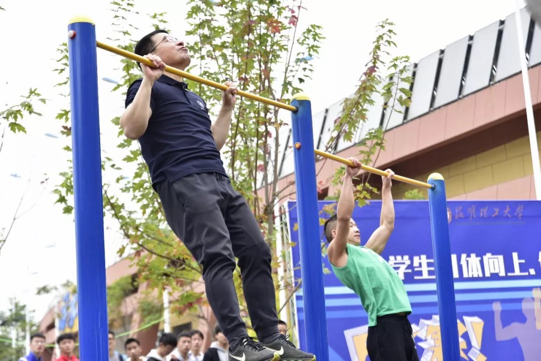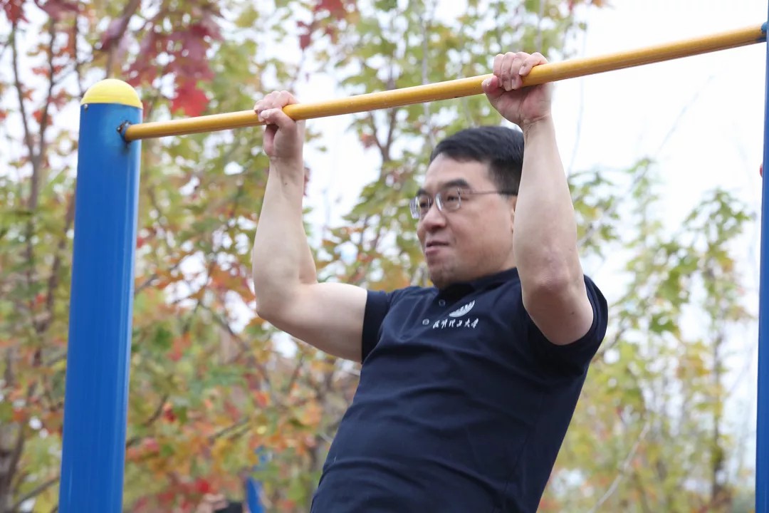 当王学勤校长脱下外套,上杠开始比赛时,在场师生惊呆了!“动作标准啊”“校长真厉害”,在大家的鼓劲呐喊下,他以15次的成绩结束比赛,用实力证明自己一点不比同学们差,而且还超越了参赛的多名同学。