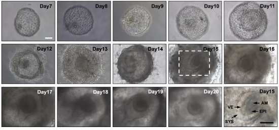 虽然灵长类动物早期胚胎发育与人高度相似,但对于灵长类动物着床后胚胎发育的研究依然难以开展,人力物力花费巨大,为了深入探索灵长类胚胎着床后发育过程中的分子机制,研究团队实现了食蟹猴胚胎体外20天的培养,培养胚胎呈现出了与体内发育胚胎高度一致的形态学与基因表达特征。