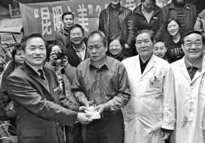 昆明之美看望张正祥,并送上一万多捐款。(前排左一为顾中国) 本报记者 江洋 摄