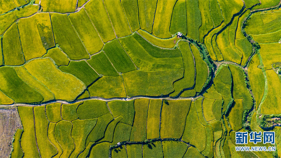 鸟瞰德宏傣族景颇族自治州盈江坝,稻田披金似油画。(8月31日摄)。新华网发(尹以祜 摄)