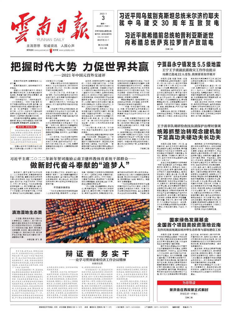 新年前夕,国家主席习近平发表二〇二二年新年贺词,深情回顾党的百年奋斗光辉历程,着眼实现中华民族伟大复兴的宏伟目标,发出“我们唯有踔厉奋发、笃行不怠,方能不负历史、不负时代、不负人民”的号召。习近平主席诚挚的问候温暖人心,殷切的嘱托催人奋进,在我省卫生健康、科技、教育和体育系统广大干部群众中引起强烈反响,大家表示,要牢记习近平主席的嘱托,在新的一年里,咬定青山不放松,做新时代奋斗奉献的“追梦人”,在云南高质量跨越式发展的新征程中,奋力推动各项社会事业取得新进步、再上新台阶,在实现中华民族伟大复兴的伟业中贡献自己的聪明才智。