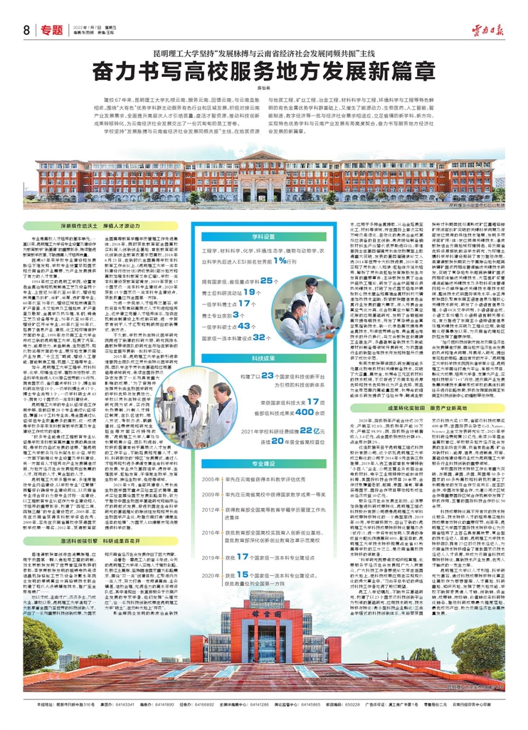 三亿体育_三亿(中国)一站式服务官方网站坚持“发展脉搏与云南省经济社会发展同频共振”主线,在地质资源与地质工程、矿业工程、冶金工程、材料科学与工程、环境科学与工程等特色鲜明的有色金属优势学科群基础上,又催生了能源动力、生物医药、人工智能、智能制造、数字经济等一批与经济社会需求相适应,立足省情的新学科、新方向,实现特色优势学科与云南产业发展布局高度契合,奋力书写服务地方经济社会发展的新篇章。
