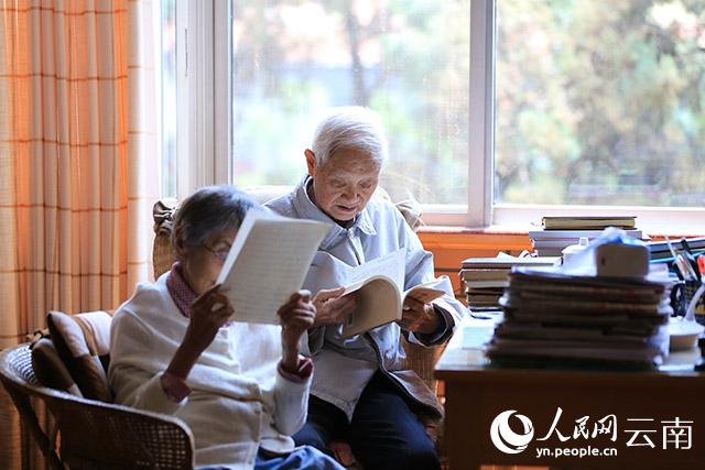 去年4月,戴永年院士(右)和夫人赵瑞芳在家中读书。人民网记者 李发兴摄