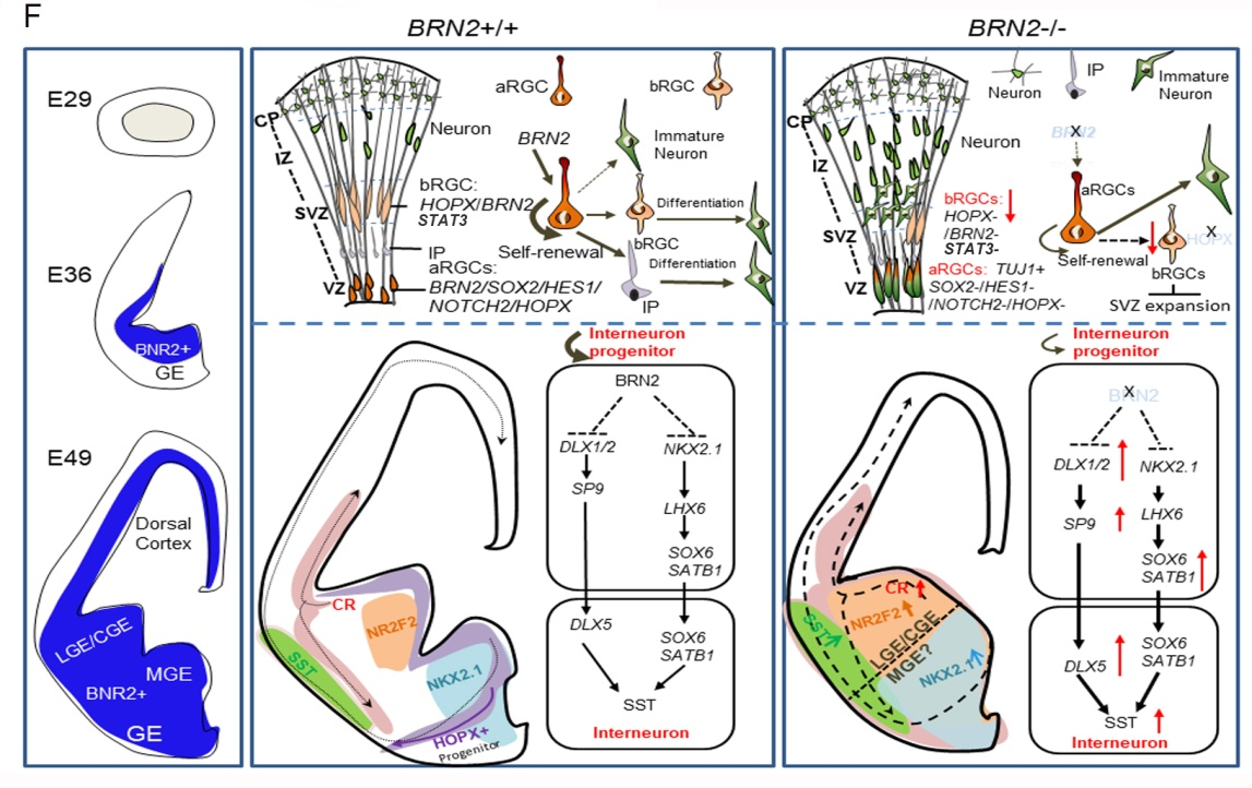 在小鼠中,BRN2表达于胎儿的神经前体细胞和皮层神经元中,基因的敲除并不影响小鼠大脑的神经发育,小鼠能健康出生。研究人员发现,该基因特异地表达在食蟹猴胎儿早期腹侧端脑的神经前体细胞,明显早于小鼠上的表达。通过对不同发育阶段猴胎儿脑的分析显示,该基因的表达与猴侧脑室神经干细胞的增值和扩张紧密相关。通过对基因敲除猴的研究,研究人员发现该基因缺乏将导致神经前体细胞提前分化为中间神经元,引起中间神经元的发育异常。