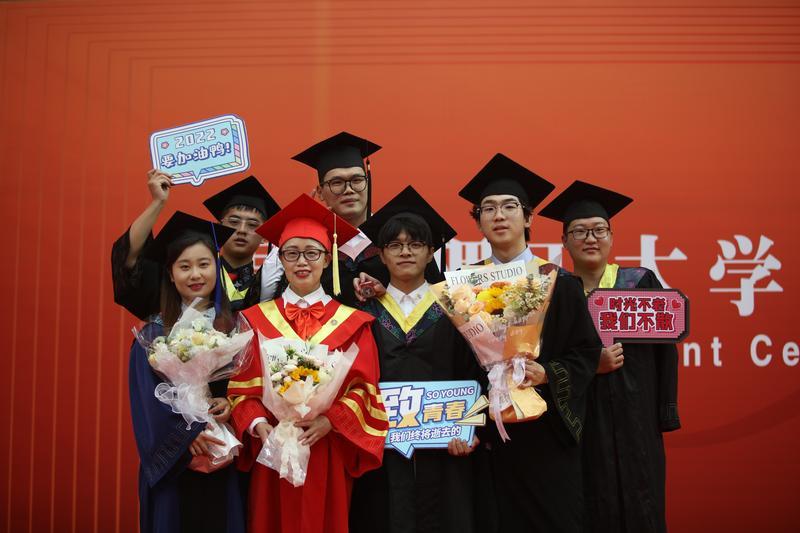 学位授予仪式上,参加仪式的校领导为毕业生一一拨穗、合影留念,并送上真诚的祝福。