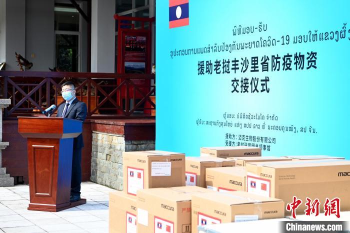 中新网昆明8月26日电 (陈静)26日,援助老挝丰沙里省防疫物资交接仪式在老挝驻昆明总领事馆举行。中国企业迈克生物股份有限公司移交了价值390809元人民币的防疫物资,包括全自动化学发光免疫分析仪、新冠抗体检测试剂、新冠核酸提取仪等。