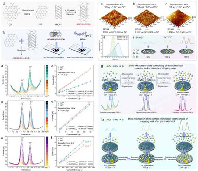据介绍,电化学阳极溶出伏安法在重金属离子检测领域中的应用前景十分广阔,然而受限于传感器活性位点的限制和微型化的需求,目前已经开发的传感器仅适用于低浓度水平重金属离子的灵敏检测。宁平、瞿广飞教授团队的相关研究中,合理地设计了一种同时具有高电导率和丰富表面官能团的三维碳基纳米复合材料(rGO/MWCNTs-COOH),并基于此材料的传感机制开发了一种三段线性“自适应”检测逻辑,显著提升了其检测上限。实验结果表明,该纳米复合材料修饰的丝网印刷传感器对Cd(II)和Pb(II)的检测限为20ng/L、线性检测范围为0.1—1350μg/L。本研究进一步开发了电化学技术在检测重金属离子中的应用潜力,提出的“自适应”检测逻辑可能为智能传感领域开辟了新的研究方向。
