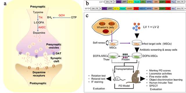 研究团队开发出了用于帕金森疾病治疗的可持久稳定分泌多巴胺的基因工程化间充质干细胞,将其移植到大鼠和猴帕金森模型后,通过恢复纹状体多巴胺水平,患帕金森疾病动物可在两周左右快速恢复其运动和非运动障碍缺陷。通过1次移植,长达5年结果的评价证明了该方法在非人灵长类动物帕金森模型中的长期疗效和安全性,显示出未来在帕金森临床治疗应用中的巨大潜力。相关研究成果于2022年12月22日在国际权威期刊《自然伙伴期刊-帕金森疾病》在线发表,题为《具有合成多巴胺神经递质的基因工程化间充质干细胞成功治疗大鼠和猴子帕金森疾病》。