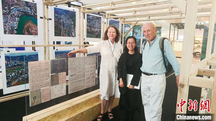 图为Sylvia Meister夫妇与策展人郑小序(中)在展览现场合影。受访者供图