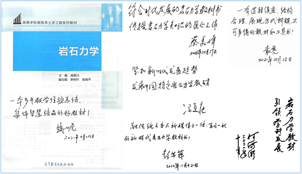 为提升教材的原创性,增强教材的思想性、科学性、时代性、系统性,促进教材体系有效转化为学生的知识体系和价值体系,吴顺川组织团队先后出版了2本教材、6部论著。其中,《岩石力学》新形态教材目前已被全国100余所高校选用,受到国内外15名院士赞许推荐,获得一线教师和专家学者好评。