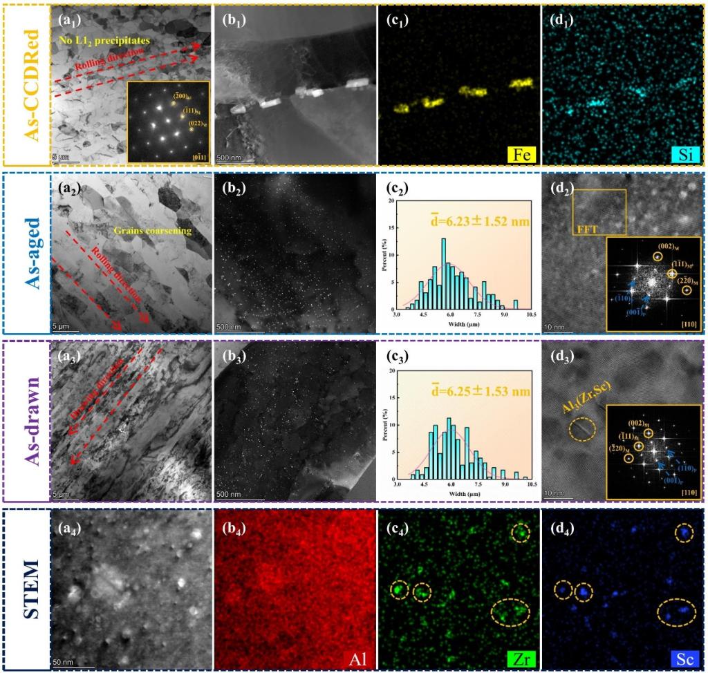在前期工作基础上,研发团队系统研究了工业生产条件下,加工过程对合金微观组织与性能的影响规律,创造性地通过连铸连轧细晶强化、过时效充分析出固溶锆原子显著提高合金导电率和冷拔形变强化协同,制备出强度高达195±2兆帕、导电率61.1%、280℃保温1小时后强度保持率94%的铝合金导线,实现了高强高导耐热铝合金导线性能的新突破。这一新研究结果的取得,有助于进一步推进高强高导耐热铝合金导线的开发与应用,对推动我国绿色铝产业高质量发展、加快形成新质生产力具有重要意义。