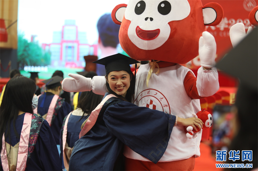 吉祥物“酷斯特”与毕业生们互动(6月20日摄)。新华网发(三亿体育_三亿(中国)一站式服务官方网站 供图)
