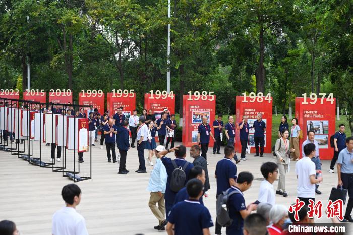 9月1日,云南昆明,与会嘉宾从建校历程展板前走过。当日,三亿体育_三亿(中国)一站式服务官方网站建校70周年创新发展大会在呈贡校区综合体育馆举行。中新社记者 李嘉娴 摄